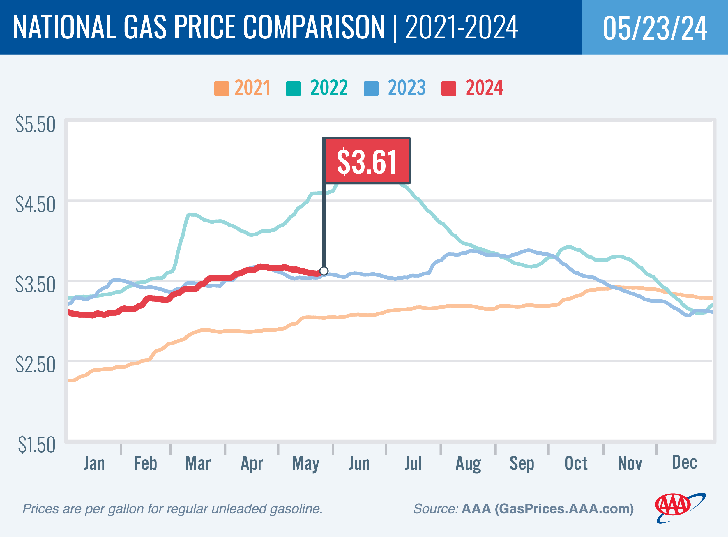 The national average for a gallon of gasoline wobbled slightly since last Thursday before settling one cent higher at $3.61. The lack of pump price movement is typical in the days leading up to Memorial Day. However, with AAA forecasting a record 38.4 million drivers hitting the road for the long weekend, the price needle could point a bit higher, at least temporarily.